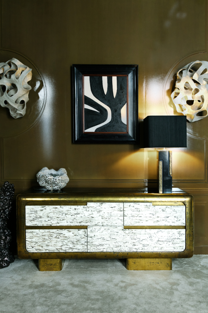 Quand le concept de buffet doit être différent… Le FONN est fait de tensions et de courbes, jouant avec ses trois matériaux, la résine évoquant l’écorce, la laque et le bronze.