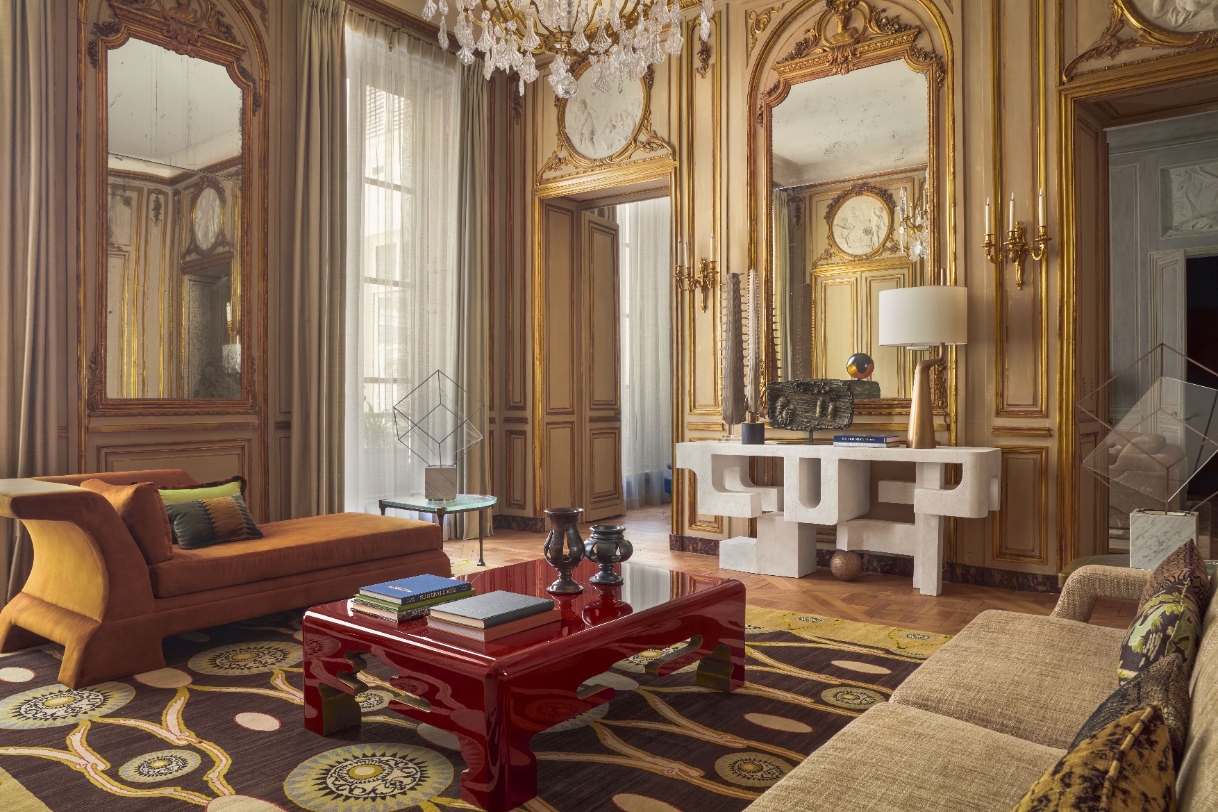 «Laiton, velours, bois précieux… rappellent la sophistication d’un appartement parisien dans une maison de campagne. »