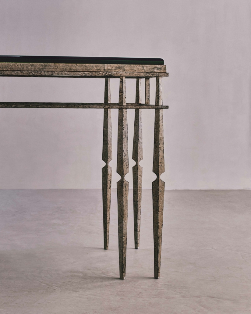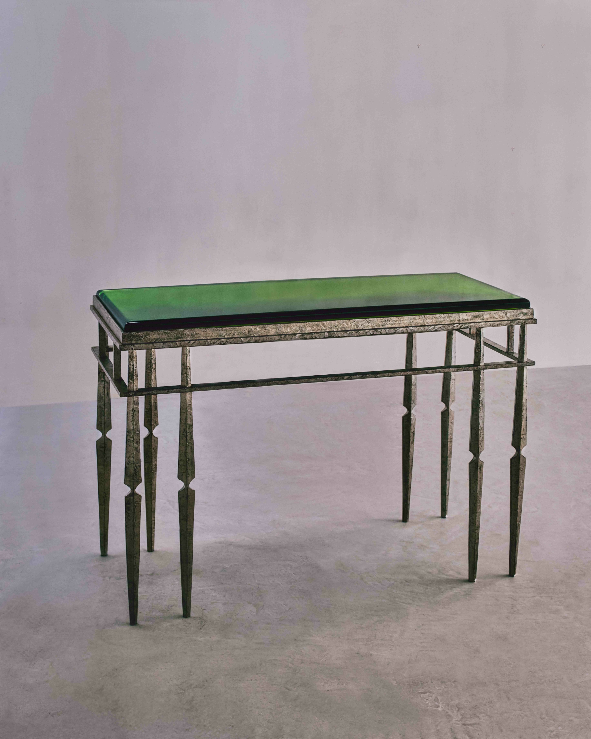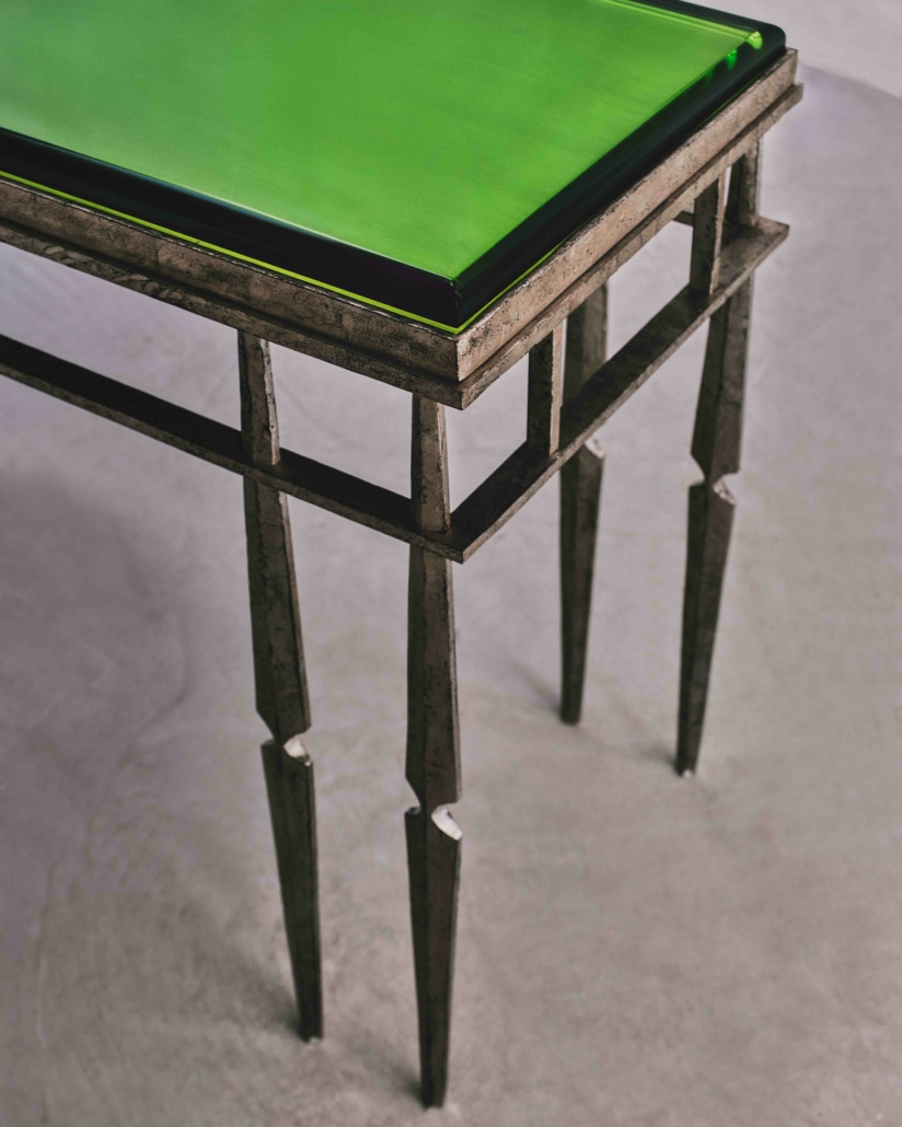 Consoles, tables, steles, these strict yet weightless structures, slender yet strong, arranged in martial alignments of blades and swords forged from iron, GLEVV pieces are jewel-like furnishings, their luminous resin tops in tangy hues recalling rings set with rubies and emeralds.